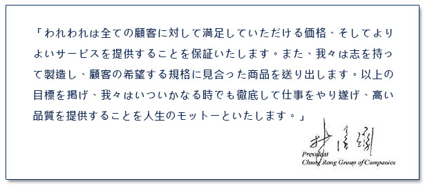 「われわれは全ての顧客に対して満足していただける価格、そしてよりよいサービスを提供することを保証いたします。また、我々は志を持って製造し、顧客の希望する規格に見合った商品を送り出します。以上の目標を掲げ、我々はいついかなる時でも徹底して仕事をやり遂げ、高い品質を提供することを人生のモットーといたします。」